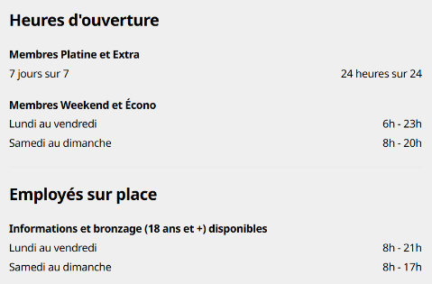 Si un gym n'est pas 24/7, l'horaire est le même pour tous les membres, peu importe leur type d'abonnement (certaines exceptions s'appliquent, consulte les heures d'ouverture sur la page gym).