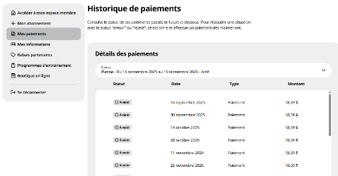 Tu peux consulter les détails de ton abonnement, incluant les détails de tes versements, en tout temps dans ton Espace Membre!