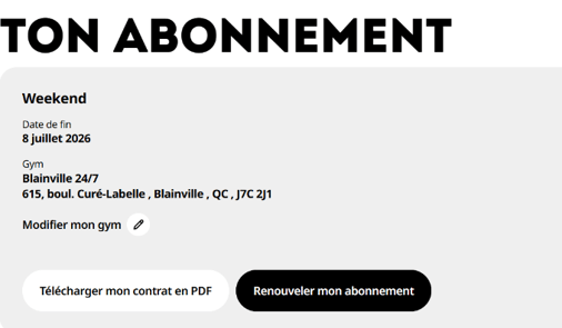 Une fois ta réinscription complétée, passe au comptoir de ton gym pendant les heures avec employés pour réactiver ta carte de membre et confirmer ton nouvel abonnement. Cela garantit que tout est bien à jour dans ton dossier.